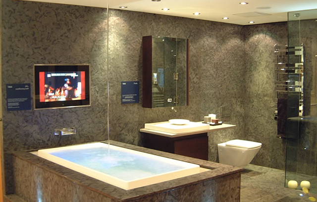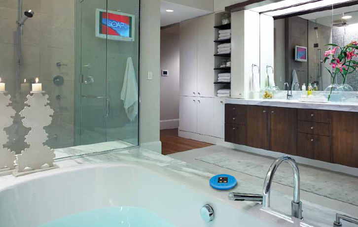 Le luci della zona benessere si accendono automaticamente al tuo ingresso e gradualmente aumentano d’intensità in base alla luce proveniente dall’esterno. Sfiora lo specchio e gestisci dal touch screen a scomparsa le sfumature di colore della cromoterapia, il getto dell’acqua, la temperatura interna e l’archivio musicale, per donarti meritati momenti di relax quotidiano, anche restando comodamente immerso nell’acqua attraverso l’unico telecomando touch screen del mondo capace di galleggiare.